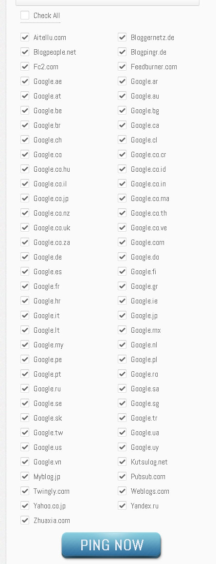 Pinging означава да уведомиш търсачките и rss директориите че в блога ти има ново съдържание, така че те да го индексират максимално бързо. Не че няма да го намерят, но по-бързото индексиране е за предпочитане. Така помагаш на сайта да се класира по-добре в индекса на търсачките. Този сайт auto-ping.com предлага такава услуга. Можеш и ръчно да добавяш url-а на сайта си но автоматичното конфигуриране е за предпочитане. Ето как става това: