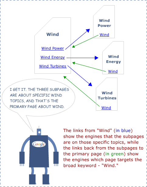 Резултата е че търсачката идентифицира свързаемостта между тези страници и ги категоризира за тези думи. По дума “вятър” сайта ни се придвижва напред.